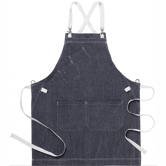 Kvalitet: 50% bomull 50% linne Mått: 75x90cm Färg: marinblå Justerbara upphängare karbinhake D-ringar på sidan Loop i sidan Bröstfickor Dubbelpåse på magen Tvätt 40°C.