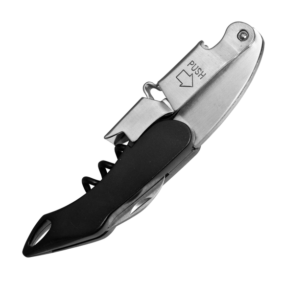 En praktisk korkskruv som gör det enkelt och smidigt att öppna vinflaskor utan att skada eller förstöra korken. Dessutom är den utrustad med en inbyggd kapsylöppnare och foliekniv. Ett måste för barer, restauranger och hotell.