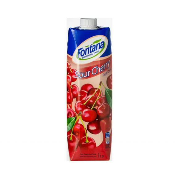 En juice i smak av Sour Cherry från Fontana. Den rubinröda fruktdrycken är gjord på mogen körsbär som ger juice en sötsyrlig smak. En drickfärdig dryck som passar utmärkt till drinkar och cocktails.