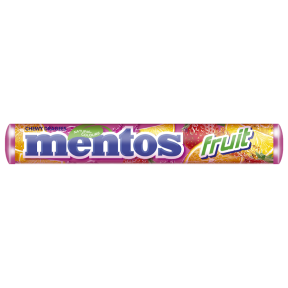 Mentos i smak av frukt är ett friskt tuggodis som smakar ljuvligt. Godiset är ovalformat med ett hårt skal och ett mjukt otroligt gott innehåll. Ett perfekt snacks när du är lite extra sötsugen.