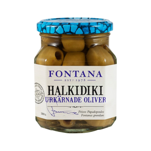 Stora, gröna Halkidiki-oliver från Fontana med en utsökt sälta och lätt krispig konsistens. Oliverna är handplockade och naturligt konserverade i saltlag. Perfekta både som ingrediens i matlagning och som tilltugg!