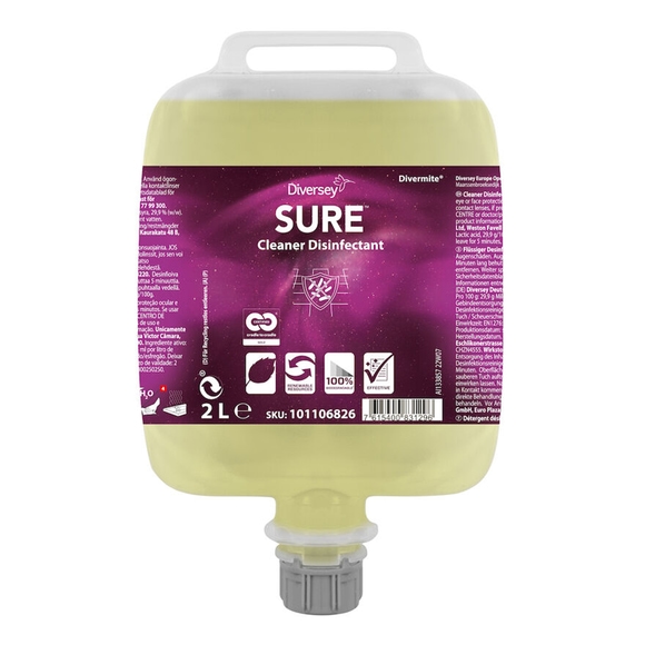 SURE Allrent & Desinfektion är ett pålitligt rengöringsmedel som är avsett för påfyllning i Diverseys Divermite-system. Produkten är växtbaserad, 100 % biologiskt nedbrytbar och miljömärkt, vilket gör den till ett mycket hållbart val som uppfyller dagliga rengöringsbehov. Perfekt för enkel och hygienisk rengöring!