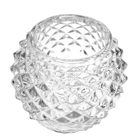 Transparent ljuslykta med ett vackert mönstrat glas. Den runda designen sprider ett mjukt ljus som reflekteras vackert i det bubbliga glaset. Perfekt belysning för restauranger, hotell och caféer.