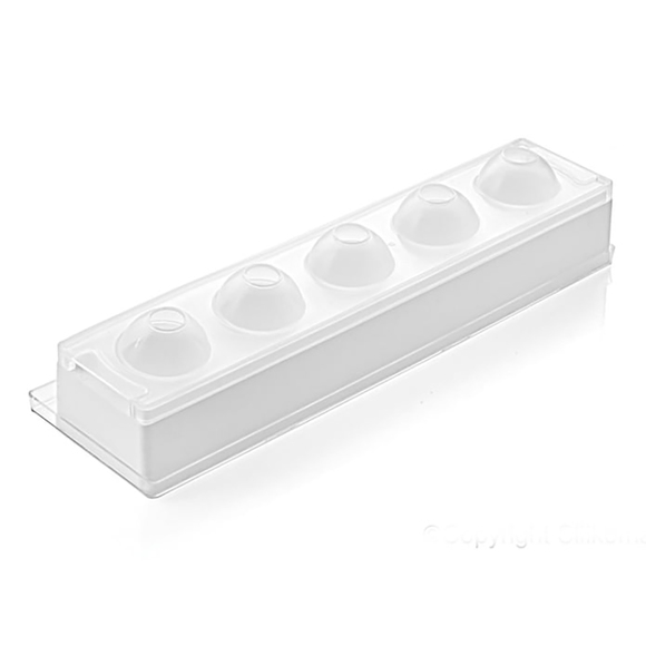 En tvådelad silikonform från Silikomart som formar hela ägg. Formen kan tillverka fem ägg åt gången och klarar både frysning och ugnstillagning. Perfekt för att skapa läckra desserter på bagerier, hotell och restauranger!