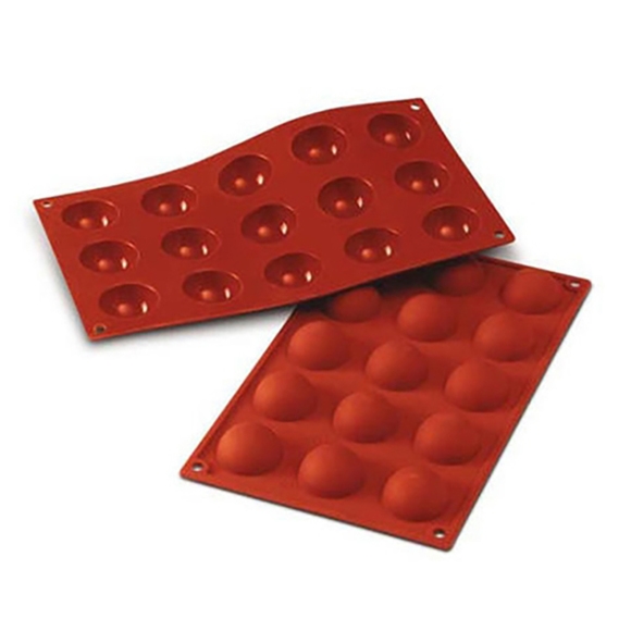 Silikonform ”Half Sphere” från Silikomart med 15 stycken klotformade figurer. En stabil och smidig bakform för tex praliner, tryfflar och andra mindre bakverk. Formen är tillverkad i livsmedelsgodkänt silikon som klarar både frysning till -60°C och ugn upp till +230°C. Väl anpassad för professionell användning.