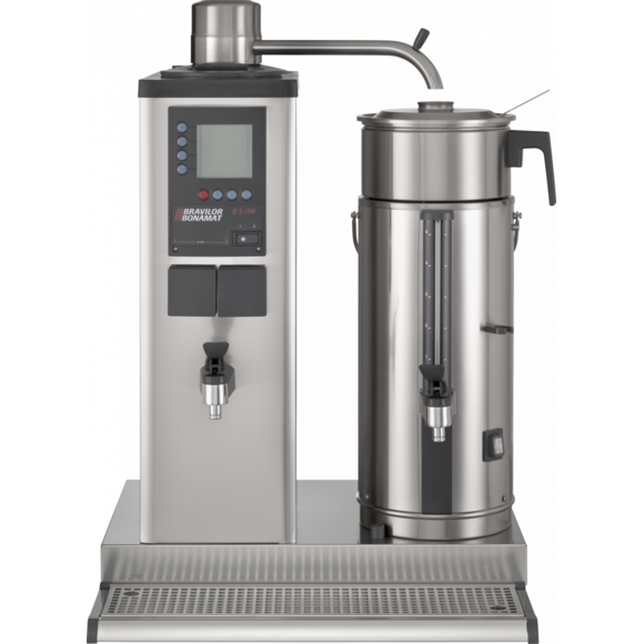 Urnbryggare från Bonamat för korgfilter med separat hetvattenkran och för utrymmen med vattenanslutning. Brygger stora mängder kaffe i separata behållare. Utrustad med digital display, total- och dagräknare, avkalkningssystem, signal när kaffet är klart, inbyggd timer och hög säkerhet. Levereras med behållare av VHG-typ, bryggenhet(er) och spillbricka. 1 bryggpelare med separat hetvattenkran och 1 behållare på 5 liter (till vänster eller till höger om pelaren). Gör att du enkelt kan sätta ihop exempelvis dubbel eller trippelmaskiner.