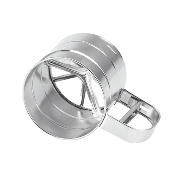 En robust pudersikt i metall, utformad som en cylinder med finmaskigt nät för jämn och kontrollerad pudring av exempelvis florsocker, kakao eller mjöl. Det praktiska handtaget ger ett stabilt grepp och gör redskapet enkelt att använda i intensiva köksmiljöer. Ett hållbart och effektivt verktyg för exakt finish vid bakverk och desserter.