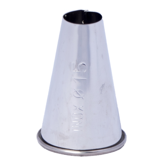 Rund spritstyll, 15 mm, i rostfritt stål från Bakers. Ett proffsigt munstycke till spritsern som gör det möjligt att skapa vackra runda mönster på tårtor eller andra bakverk. Utmärkt verktyg för konditori och bageri.