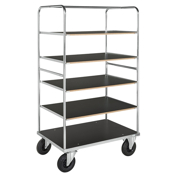 En robust och praktisk etagevagn från Kongamek. Vagnen har en slitstark, elförzinkad stålställning med fyra hyllplan i laminat samt en bottenskiva för extra förvaring. Den är utrustad med två fasta och två länkhjul i massivt gummi, vilket ger både stabilitet och god rörlighet. Perfekt för förvaring och transport av matvaror, köksutrustning eller annan tung last inom professionella serveringsmiljöer.