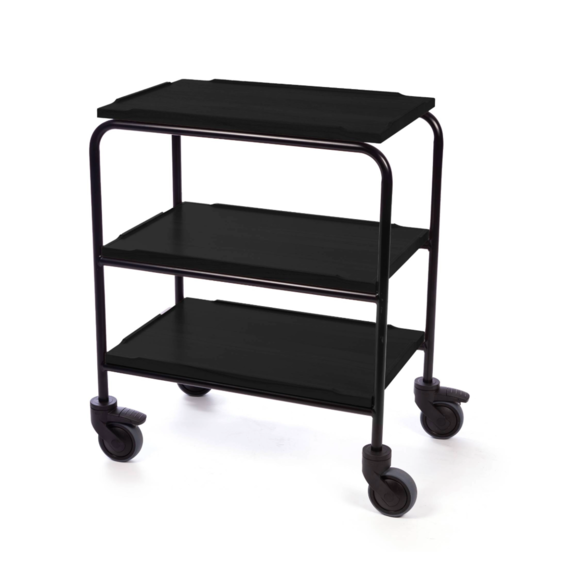 Denna serveringsvagn med 3 hyllplan från Hallins är ett måste för alla restaurang- och hotellverksamheter. Vagnen är perfekt för att transportera roomservice till gäster, fungera som serveringsvagn för kaffe, mat och dryck, eller användas som avlastningsyta. Tillverkad med svarta laminatskivor, är den tålig och klarar av daglig användning utan att slitas.