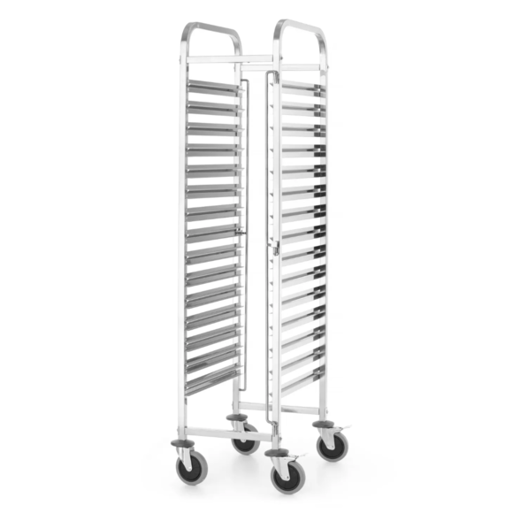 En robust och rymlig kantinvagn framtagen för effektiv hantering och transport av kantiner i professionella kök. Tillverkad i rostfritt stål och utrustad med profilerade skenor som håller kantinerna stabilt på plats under förflyttning. Vagnen rymmer upp till 15 st GN 1/1, alternativt 30 st GN 1/2 eller 45 st GN 1/3, vilket gör den mycket flexibel för olika arbetsflöden. Smidig att manövrera tack vare gummiförsedda svänghjul, varav två med broms, och med praktiska hörnskydd som minskar risken för skador på både vagn och omgivning. Enkel att montera och mycket stabil när den väl är på plats.