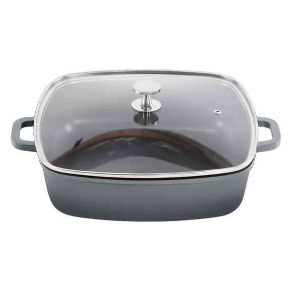 Denna gråa, rektangulära gryta av gjuten aluminium från AluChef erbjuder utseendet av ett gjutjärn men med en betydligt lägre vikt. Grytan är designad för att möjliggöra hälsosam matlagning och tål höga temperaturer, vilket gör den idealisk för olika matlagningstekniker. Grytan kommer med ett transparent lock, vilket gör det enkelt att övervaka matlagningen utan att behöva lyfta locket. Ett utmärkt val för både restauranger och hotell.