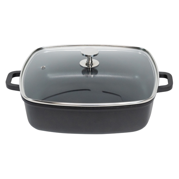 Denna svarta, rektangulära gryta av gjuten aluminium från AluChef erbjuder utseendet av ett gjutjärn men med en betydligt lägre vikt. Grytan är designad för att möjliggöra hälsosam matlagning och tål höga temperaturer, vilket gör den idealisk för olika matlagningstekniker. Grytan kommer med ett transparent lock, vilket gör det enkelt att övervaka matlagningen utan att behöva lyfta locket. Ett utmärkt val för både restauranger och hotell.