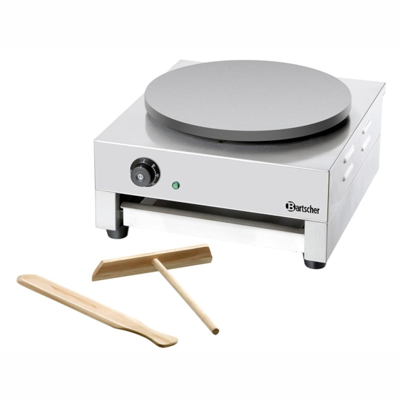 Detta kraftfulla elektriska crêpejärn från Bartscher gör det enkelt att grädda perfekt tunna och jämnt brynta crêpes – varje gång. Den teflonbelagda gjutjärnsplattan på 40 cm ger snabb uppvärmning, jämn värmefördelning och hög kapacitet, perfekt för restaurang, café eller bufféservering.