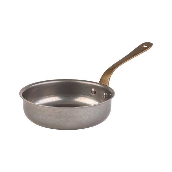 Minipanna från APS i serien Vintara. Pannan har en rustik design i rostfritt stål med mässingshandtag. Perfekt för servering av tapas, potatis, såser och andra tillbehör på restauranger och hotell.