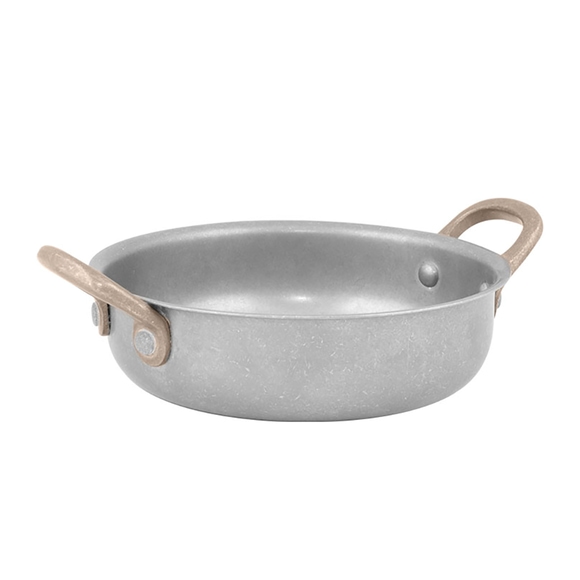 En rustik panna i antikbehandlat rostfritt stål från Bonnas serie Antique. Den behandlade ytan ger inte bara pannan en unik karaktär, utan gör den även motståndskraftig mot repor och fläckar. Perfekt för servering av smårätter och tillbehör på restauranger och hotell.