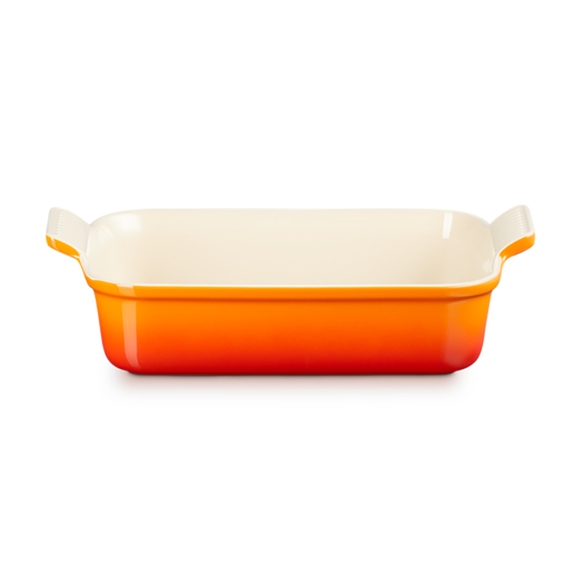 Le Creusets ugnsform från Heritage-kollektionen är framtagen av högkvalitativt stengods som säkerställer jämn värmefördelning. Ugnsformen har en vacker orange design och är utrustad med praktiska två handtag, vilket underlättar matlagningen. Perfekt för allt från gratänger och lasagne till pajer och desserter!