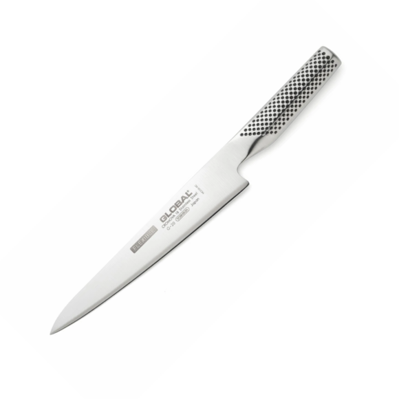 En filékniv från Global, utvecklad för precisionsarbete i restauranger, storkök och fiskberedning. Det flexibla bladet gör kniven mycket följsam, vilket underlättar vid filéering av fisk och gör det enkelt att arbeta runt ben och under skinnet. Denna modell har ett något längre och bredare blad än en traditionell filékniv, vilket gör den särskilt lämplig för att filéa större fiskar. Den välbalanserade konstruktionen ger god kontroll vid noggrant skärarbete.