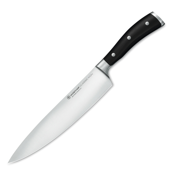 Kockkniv från Wüsthofs serie Classic Ikon. En mångsidig kniv som med sitt breda blad kan användas till att skära allt från grönsaker och frukt till fisk och kött. Det svarta och stilrena skaftet är ergonomiskt utformat och ligger bekvämt i handen. En måste för er som söker mångsidighet och skärpa.