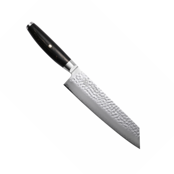 En exklusiv kiritsuke-kniv från Yaxells serie Ketu, framtagen för precision och balans i professionella kök. Bladet är uppbyggt av tre lager stål med en kärna i det extremt hårda pulverstålet SG2, vilket ger en sylvass egg med ca 12° slipvinkel och en hårdhet på 63 HRC. Den hamrade tsuchime-finishen och den blästrade våglinjen ger kniven ett karaktäristiskt, japanskt uttryck. Handtaget i ljus och mörk pakkawood är både hygieniskt, vattentåligt och perfekt balanserat tack vare den rostfria ändknappen.