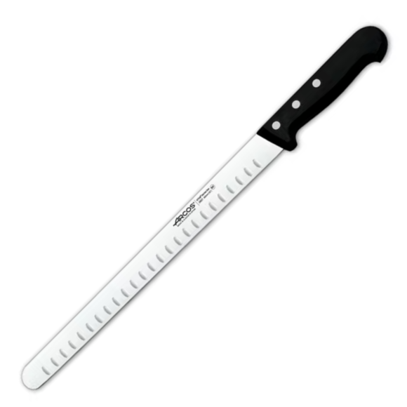 En laxkniv från Arcos, utvecklad för professionell användning i restauranger, storkök och catering. Det långa och halvflexibla bladet gör kniven idealisk för att skära mycket tunna och jämna skivor av lax och andra fiskar. Den breda klingan ger god stabilitet och kontroll vid skärning och servering. Kniven kan även användas för att skära kakor och bakverk där ett långt, jämnt snitt behövs.