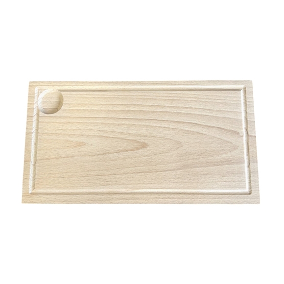 En klassisk planksteksbräda i bok från AT-Line. Träslaget bok är känt för sin täthet och jämnhet, vilket ger en hållbar och estetiskt tilltalande yta. Brädans skåra fångar enkelt upp köttsaft och vätska vilket minskar spill, medan det utfrästa hålet passar utmärkt för placering av en grillad tomat eller andra tillbehör. Brädan är perfekt för servering av plankstek, men även för andra rätter och tilltugg på krogar och restauranger.