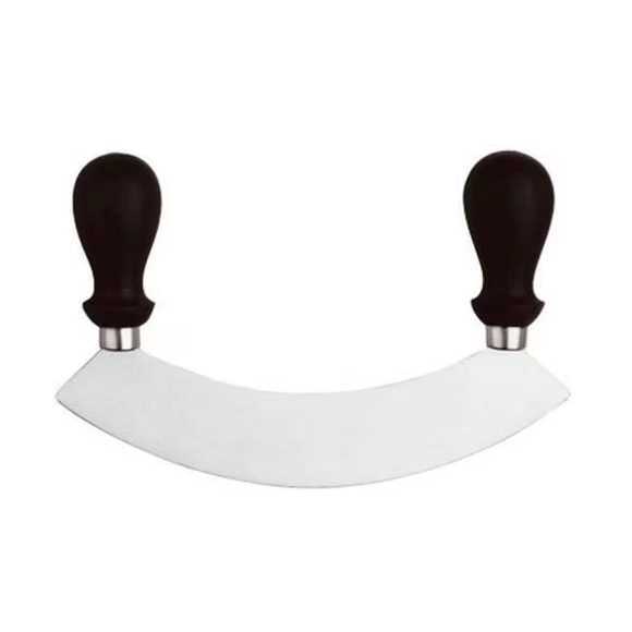 En skarp och effektiv pizza- och örtskärare, även kallad örtvagga, från Paderno. En mycket pålitlig partner för att både finhacka örter och slica upp pizzor. De två ergonomiska handtagen och det böjda knivbladet gör det enkelt och bekvämt att snabbt hacka upp kryddorna till perfektion. Ett måste i alla storkök och restauranger!