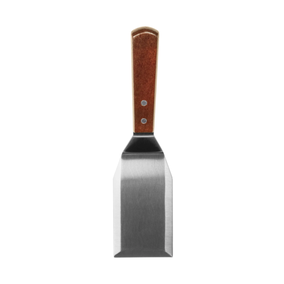 En hamburgerspade, utvecklad för professionell användning i restauranger, grillkök och storkök. Spateln är tillverkad i rostfritt stål 18/0 och har ett handtag i Sapele-trä med skyddande lack som ger ett bekvämt grepp och god hållbarhet.