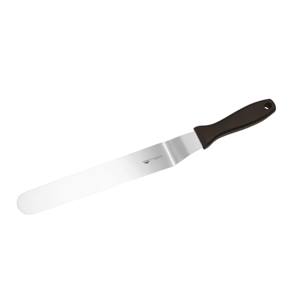 En vinklar och flexibel palettkniv från Paderno. Kniven har ett långt, tunt och rundat blad som ofta används vid bakning för att jämnt sprida ut krämer och liknande. Ett redskapet likt detta bör finnas på diverse restauranger, caféer och bagerier.