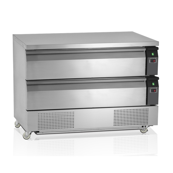 Denna kylbänk UD2-3 på hjul från Tefcold har två stycken lådor som är individuellt justerbara mellan kyl och frys, beroende på vilken funktion som efterfrågas. Den har stor förvaringskapacitet och en ventilerad kyla för snabba temperaturökningar och sänkningar. Dessutom har den automatisk avfrostning vilket gör att den håller sig fräsch längre. Ett mycket bra val för restaurang-, café och annan liknande verksamhet!