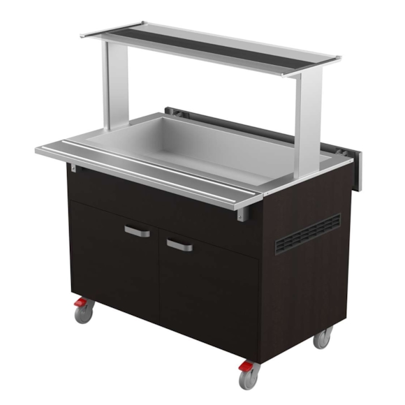 Buffévagn, kall, 1200 från Coolpart för 3 x GN 1/1. Vagnen är utrustad med en kyld brunn, fällbara brickbanor längs långsidorna, belysning och 4 rullbara hjul varav två med broms. En perfekt vagn för restaurang, hotell eller skolmatsal som serverar buffé.
