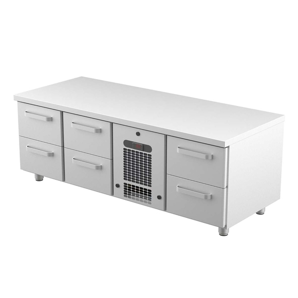 Grillkylbänk VLG-1606 i rostfritt stål från Coolpart. En praktisk bänk, som är lägre än en vanlig kylbänk med avsikt att en stenhäll, fritös eller annan utrustning ska ställas ovanpå bänken utan förändrad ergonomi. Kylbänken är utrustad med 6 st draglådor för smart förvaring och organisering av råvaror.