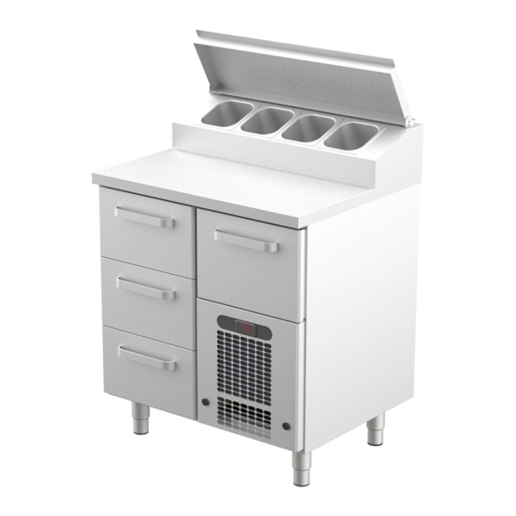 Kallskänkskylbänk KLE-804 från Coolpart är en kylbänk i rostfritt stål som är särskilt framtagen för förvaring och beredning av diverse livsmedel. Skåpet är utrustat med 4 st draglådor och en kyld ränna för 4 st GN 1/6 kantiner.