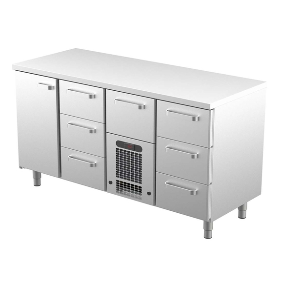 Coolparts kylbänk VLE-1617 är en GN-anpassad kylbänk som är tillverkad i rostfritt stål och även utrustad med behandlade teleskopgejder till kylbänkens lådor, samt ordentliga handtag i samma rostfria material. Lådorna har även ramar som passar GN 1/1 kantiner, men även hål som gör att du kan fixera korta avdelare för kantinerna. Kylbänken styrs elektroniskt och är fläktkyld med automatisk avfrostning samt en tövattenlåda för högsta hygien. Denna kylbänk är av högsta kvalitet och kommer att uppnå alla förväntningar.
