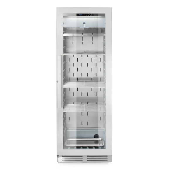 Ett avancerat hängmörningsskåp från Hendi, utvecklat för att skapa optimala förutsättningar för traditionell dry aging av kött. Skåpet återskapar ett kontrollerat mikroklimat med justerbar luftfuktighet, effektiv ventilation och UVC-sterilisering för en säker och jämn mognadsprocess. Det energieffektiva Low-E-glaset och den robusta konstruktionen i rostfritt stål gör skåpet till ett pålitligt val för