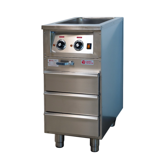 Används för varmhållning av mat i gastronormkantiner vid 60-90 C. Rymmer 2 st GN 1/1-200mm kantiner. Under vattenbadet finns en praktisk hylla med plast för extrakantiner, kastruller mm