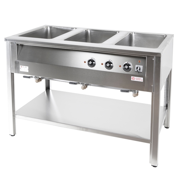 Vattenbadet på stativ med underhylla, är en perfekt lösning för varmhållning av varm mat. Passar i en mängd olika miljöer, inklusive restauranger, hotell, kaféer och barer. Med tre brunnar, var och en kapabel att rymma en GN 1/1 kantin med ett djup på 200 mm, ger denna modell överlägsen kapacitet och flexibilitet. Vattenbadet erbjuder hög effekt och håller pålitligt maten varm inom temperaturområden från 60 till 90 grader Celsius. Detta optimerar varmhållningen och säkerställer att maten serveras vid perfekt temperatur. Med termostatreglerad värme och dolt placerade element under badets botten är det enkelt att justera temperaturinställningarna, den lutande botten och avtappningsventilen ger en effektiv avrinning. Vattenbadet har en huvudströmbrytare och en infälld, skyddad panel för säker och enkel manövrering. Med en stabil konstruktion i rostfritt stål är den både hållbar och enkel att rengöra. Tillval i form av hjul finns att beställa separat, vilket ger ökad mobilitet och flexibilitet i alla professionella köksmiljöer.