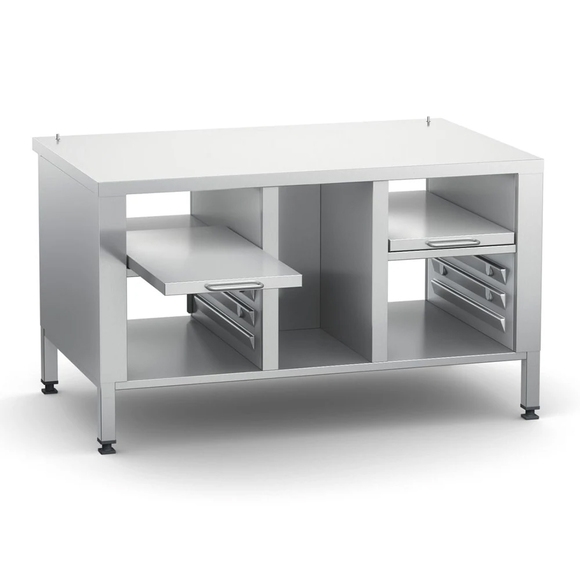 Stativ till Rationals iVario 2-XS. Stativet har 2 skjutbara hyllor samt 6 par skenor till GN1/1. Ett perfekt stativ för er som vill få upp den otroligt mångsidiga maskinen på en höjd och samtidigt få en effektiv lösning med förvaring.