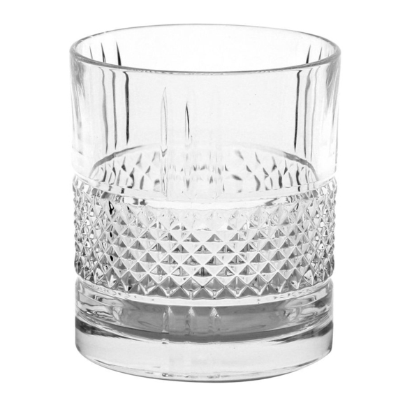 Ett DOF-dricksglas från Libbeys serie Jackie. Glasets exklusiva design är inspirerad av traditionell diamantskärning och framhäver ekokristallens naturliga lyster. Glasets låga och breda form gör det till ett utmärkt alternativ vid servering av rustika drinkar som Negroni och Whiskey Sour. Tillverkat av högkvalitativt glas klarar glaset dessutom av livliga restaurang- och barmiljöer utan problem. Ett dricksglas för professionella verksamheter som söker ett iögonfallande dricksglas som omedelbart fångar gästernas uppmärksamhet.