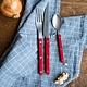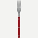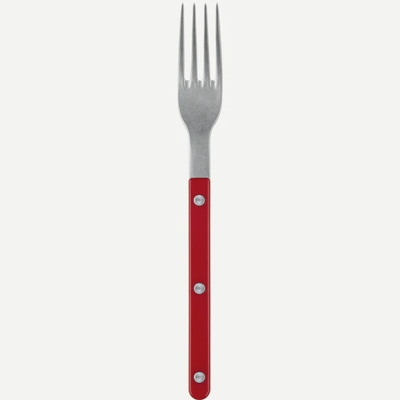 Matgaffel med rött skaft från Sabre Paris bestickserie Bistrot Vintage Solid. Seriens bestick är tillverkade av rostfritt stål med lång hållbarhet, medan de färgglada akrylskaften ger ett elegant och livfullt intryck. Ett utmärkt val för restauranger, caféer och hotell.