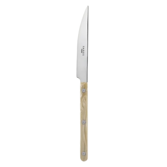 En elegant och stilren matkniv från Sabré Paris serie Bistrot Horn. Knivens vassa tänder skär enkelt genom alla typer av råvaror, samtidigt som den ser fantastisk ut. Kniven är dekorerad med ett vackert ljust mönster med fiberliknande inslag. Denna kniv kommer att lyfta din dukning, särskilt när den kombineras med andra bestick ur samma serie!