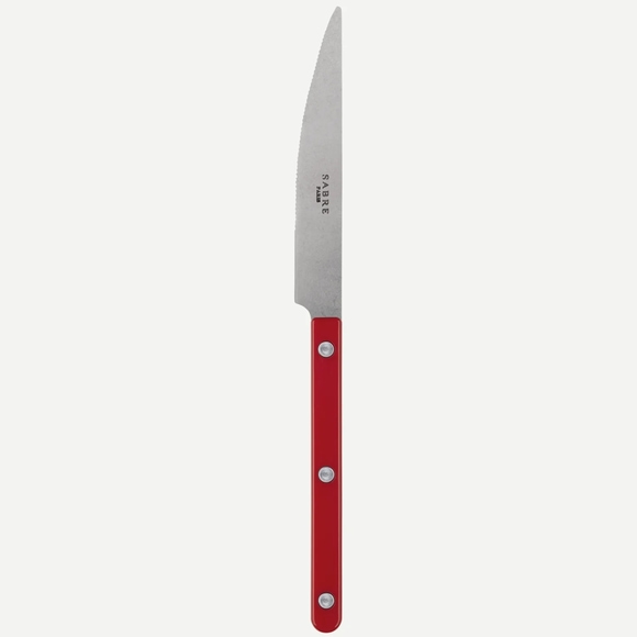 Matkniv med rött skaft från Sabre Paris bestickserie Bistrot Vintage Solid. Seriens bestick är tillverkade av rostfritt stål med lång hållbarhet, medan de färgglada akrylskaften ger ett elegant och livfullt intryck. Ett utmärkt val för restauranger, caféer och hotell.