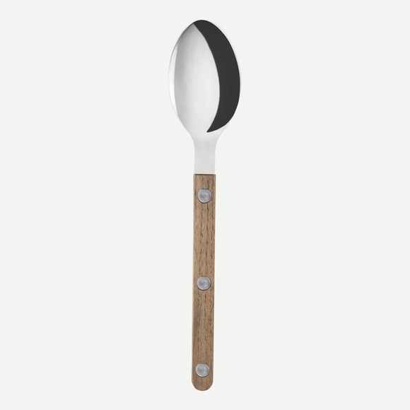 En elegant dessertsked från Sabré Paris dekorativa bestickserie Bistrot Teak, perfekt för vackra serveringar av söta desserter. Bestickens design, inspirerad av charmiga franska restauranger och caféer, skapar en traditionell atmosfär med modern touch. Det unika och stilfulla trähandtaget, de synliga nitarna och det vackra materialet, kommer garanterat pryda dukningarna i restaurangen!