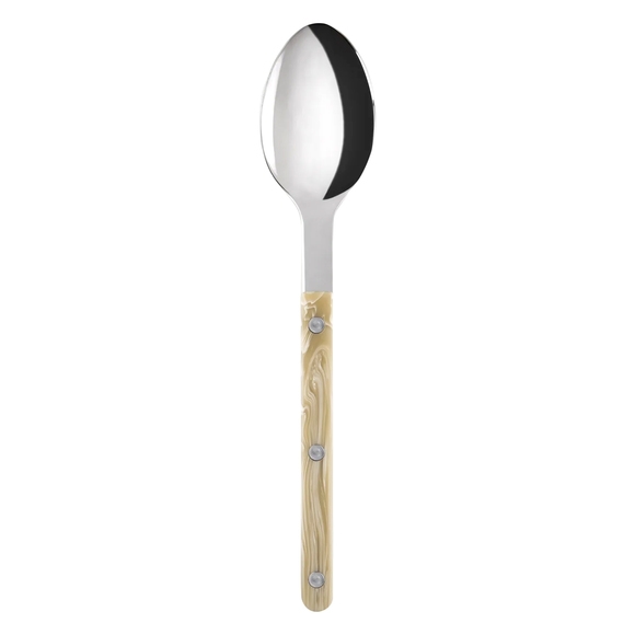 En elegant och stilfull matsked från Sabré Paris serie Bistrot Horn. Inspirerad av charmiga franska restauranger och caféer, fångar denna bestickserie den autentiska atmosfären med en modern touch. Med dess unika och stilfulla akrylhandtag, synliga nitar och vackra mönster, kommer skeden garanterat att pryda dukningarna i restaurangen på ett smakfullt sätt. Perfekt för er som vill imponera på gästerna med vackra middagsdukningar!