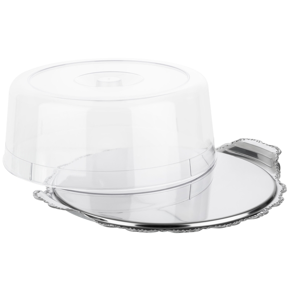Vackert tårtfat med lock i plast från APS. Dess fina kant ger dina bakverk en snygg presentation medan locket skyddar innehållet på ett effektivt sätt från stötar och annat. Det är alltså även perfekt för förvaring. Fatet är gjort i ett rostfritt stål som är lätt att rengöra. Detta tårtfat passar lika bra till vardags som till fest. Ett toppenalternativ för caféer och konditorier, men även för restauranger!