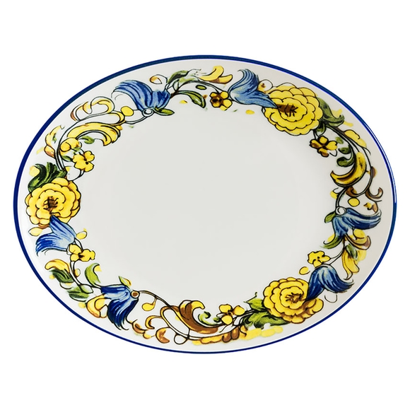 Detta ovala fat från Bonna i serien Albufera har en vacker dekorativ medelhavsdekor med blå rand. Fatet är tillverkad av högkvalitativt fältspatporslin och är anpassad för restaurangmiljöer.