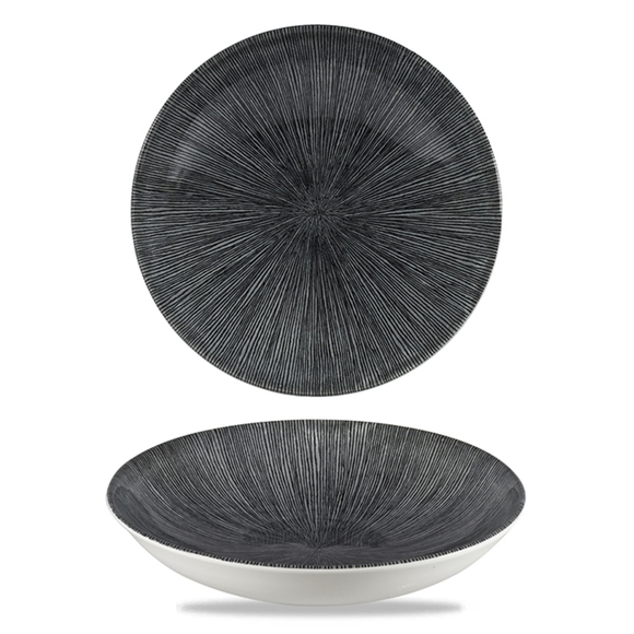 Tallrik djup 24,8cm Agano Black i serien Agano från Churchill är en svart djup tallrik tillverkad i porslin. Tallriken är medelstor och har ett vackert iögonfallande mönster som förstärker den visuella presentationen vid bordet. Tallriken lämpar sig väl till servering av olika slags grytor och soppor. Passar utmärkt för restauranger och cateringverksamheter.