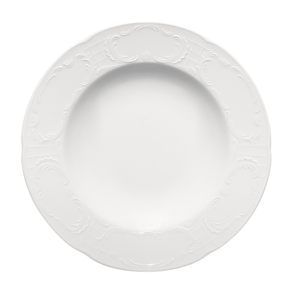 En elegant och klassisk tallrik från Bauschers serie Mozart. Den djupa tallriken är vit med ett mönster som liknar stuckaturer längs kanterna. Tallriken är tidlös och smälter enkelt in i många typer av miljöer. Den kan användas som både tallrik och skål men storleken gör porslinet främst användbar vid servering av mindre rätter likt förrätter.