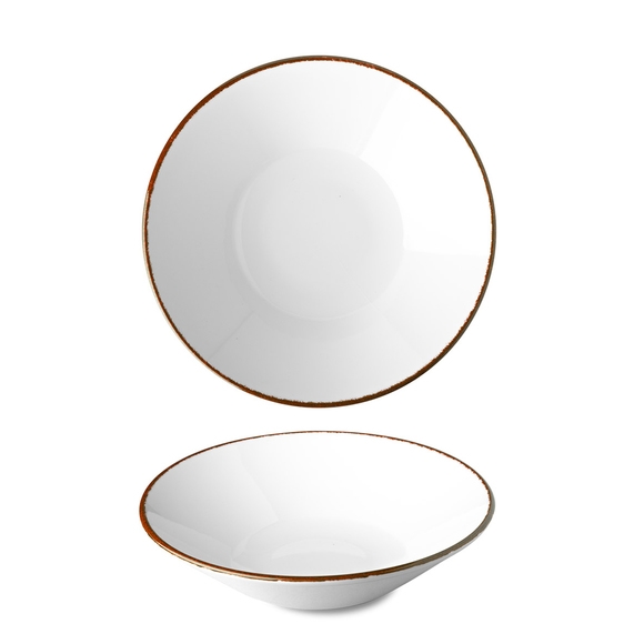 En djup tallrik i högkvalitativt porslin med en unik handmålad design från Benedicts serie Optimo Picnic. Denna djupa tallrik har en vacker brun handmålad linje längs med kanten som på ett estetiskt och genomtänkt sätt ramar in uppläggningen. Benedicts Optimo Picnic serie lämpar sig till många serveringsmiljöer där en elegant servering står i fokus. Seriens utformning bidrar till en härlig matupplevelse och tar serveringen till nya höjder.