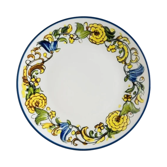 Denna flata tallrik från Bonna i serien Albufera har en vacker dekorativ medelhavsdekor med blå rand. Tallriken är tillverkad av högkvalitativt fältspatporslin och är anpassad för restaurangmiljöer.